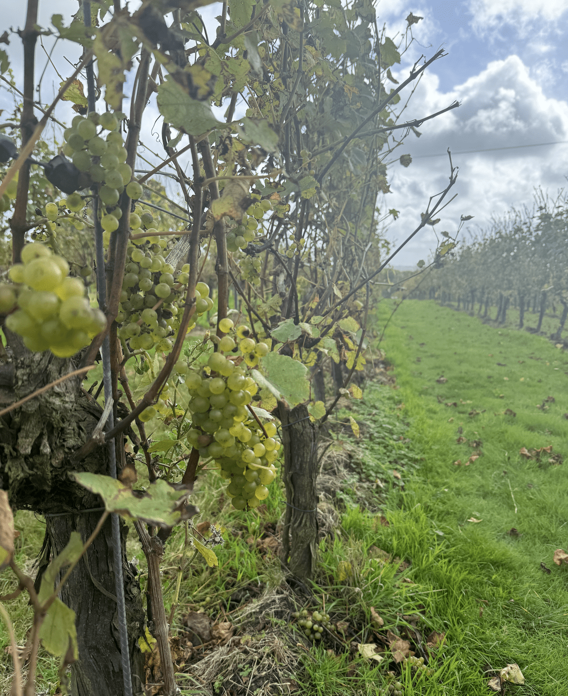 With our stomachs now full, we moved on to a tour of the estate. Walking through the fields under the bright autumn sun, we were struck by the beauty of the surrounding countryside. All we could see were rows upon rows of vines, heavy with grapes. The harvest already started a few days ago, as it rained we weren’t able to do any picking on the day but the whole process of handpicking the grapes usually takes the team under 2 weeks.