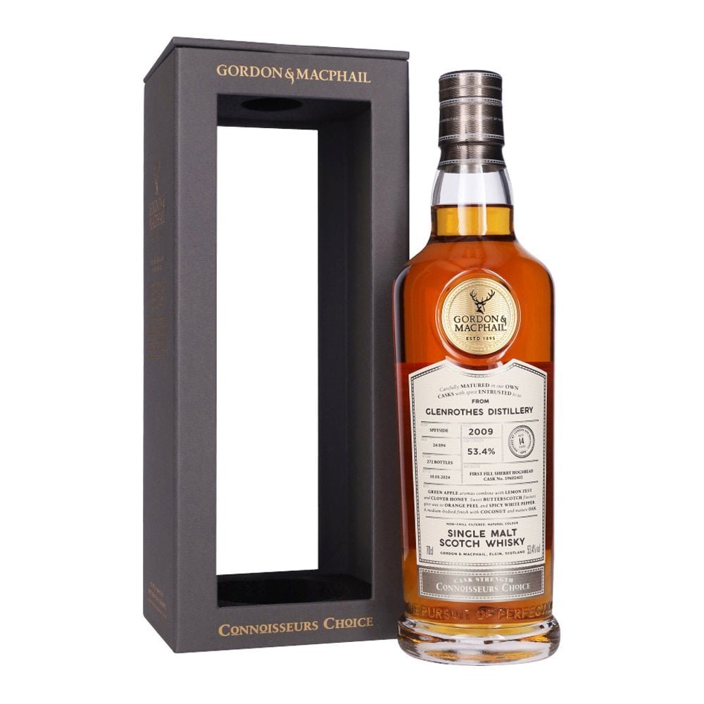 £128.99 inc. VATReleased as part of the Connoisseurs Choice from Gordon & MacPhail, this single malt Glenrothes was distilled in 2009 and matured in a first fill sherry hogshead for 14 years before being bottled at 53.4%.