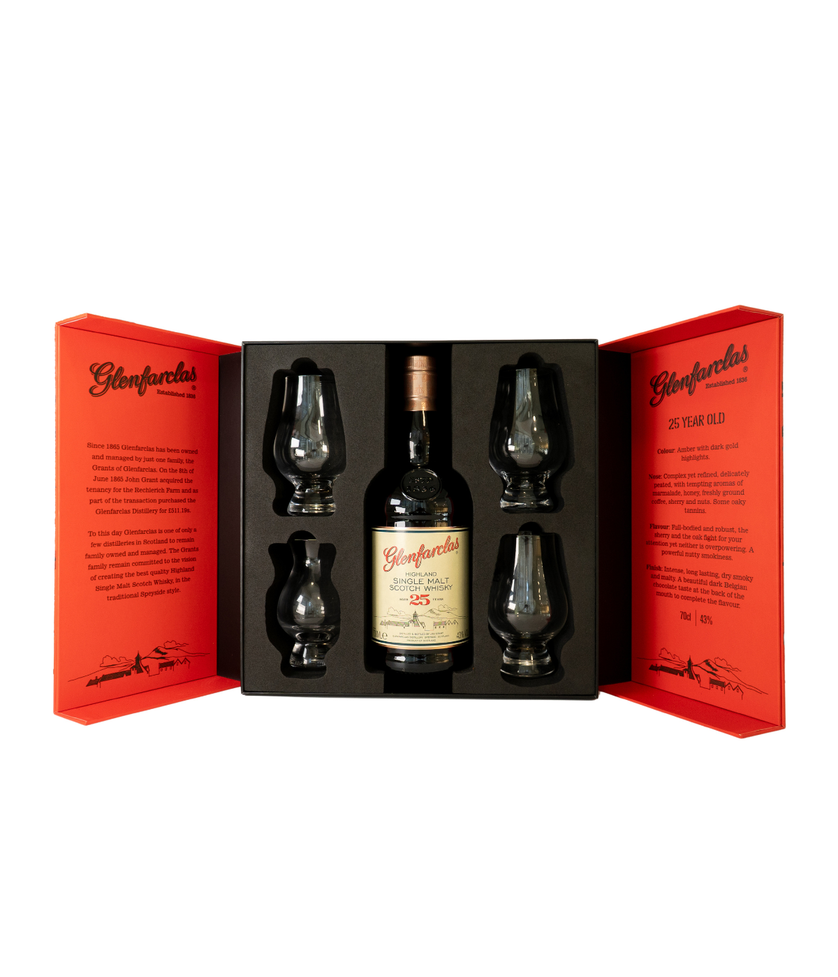 £275.00 inc. VATWe are thrilled to present a new limited-edition gift pack from Glenfarclas, a must-have for whisky collectors and enthusiasts alike. With only 500 sets available worldwide, this extremely exclusive gift pack features the exceptional Glenfarclas 25 Year Old Single Malt Scotch Whisky, matured entirely in 100% Oloroso sherry casks, delivering a rich, complex flavour profile. Recognised for its outstanding quality, this whisky was awarded Gold at the 2019 International Spirits Challenge, solidifying its status as a premium choice among connoisseurs.
